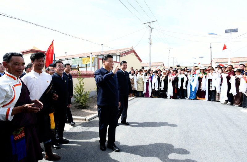 离开索南才让家,村民们看到总书记来了,热情地涌到路边,欢呼着向总书记问好。习近平动情地说,看到乡亲们过上幸福生活,我感到很欣慰。我们要继续奋斗,到新中国成立一百周年时中华民族一定能够更加坚强地屹立于世界民族之林。全面建设社会主义现代化国家,一个民族也不能少。在中华民族大家庭中,大家只有像石榴籽一样紧紧抱在一起,手足相亲、守望相助,才能实现民族复兴的伟大梦想,民族团结进步之花才能长盛不衰。习近平祝福大家“扎西德勒”。