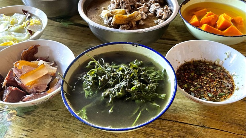 永仁人乡宴上、餐厅里、家常饭桌上,总有一碗清水菜打蘸水,他们叫“淡菜”,春季最受欢迎的“淡菜”就属斑鸠菜了。斑鸠菜,又名斑鸿菜、臭梧桐,是马鞭草科赦桐属的植物,灌木或小乔木,高可达6米,枝叶有特殊的气味。