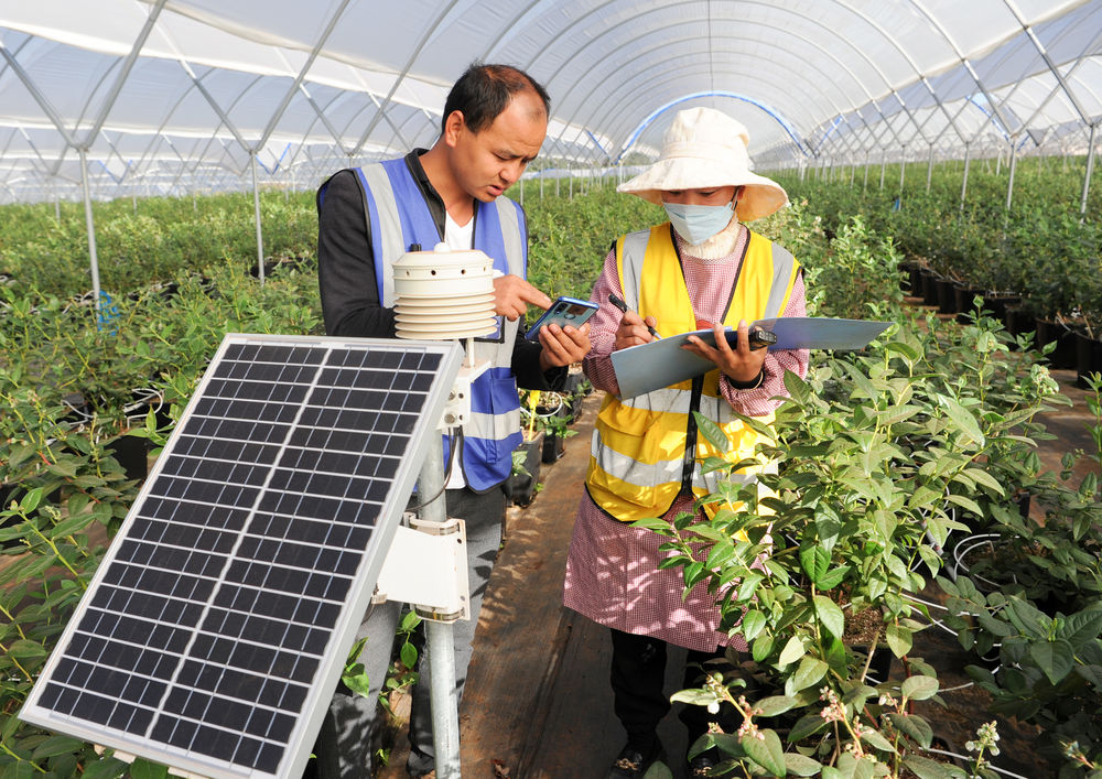 大数据“飞入”田间地头,农业生产经营管理越来越“智慧”。在宽敞明亮的大棚内,安装了气象监测仪,实时监测光照、温度、湿度。生产主管朱云辉在手机上打开水肥一体化微滴灌系统,轻轻一点,蓝莓盆栽内的4个滴箭头开始运行,水肥直达根系。“我们根据每天收集到的气象数据和基质进排液数据,对灌溉溶液、滴水施肥的时间和数量进行适时调整,在手机或电脑上就可以操作。”朱云辉一边介绍,一边感叹说:“这是物联网技术给农业发展带来的新变化。”