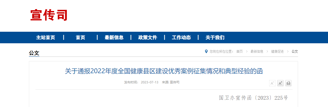 近日,由国家卫生健康委全国爱卫办联合开展的2022年度全国健康县区建设优秀案例征集活动结果公布。