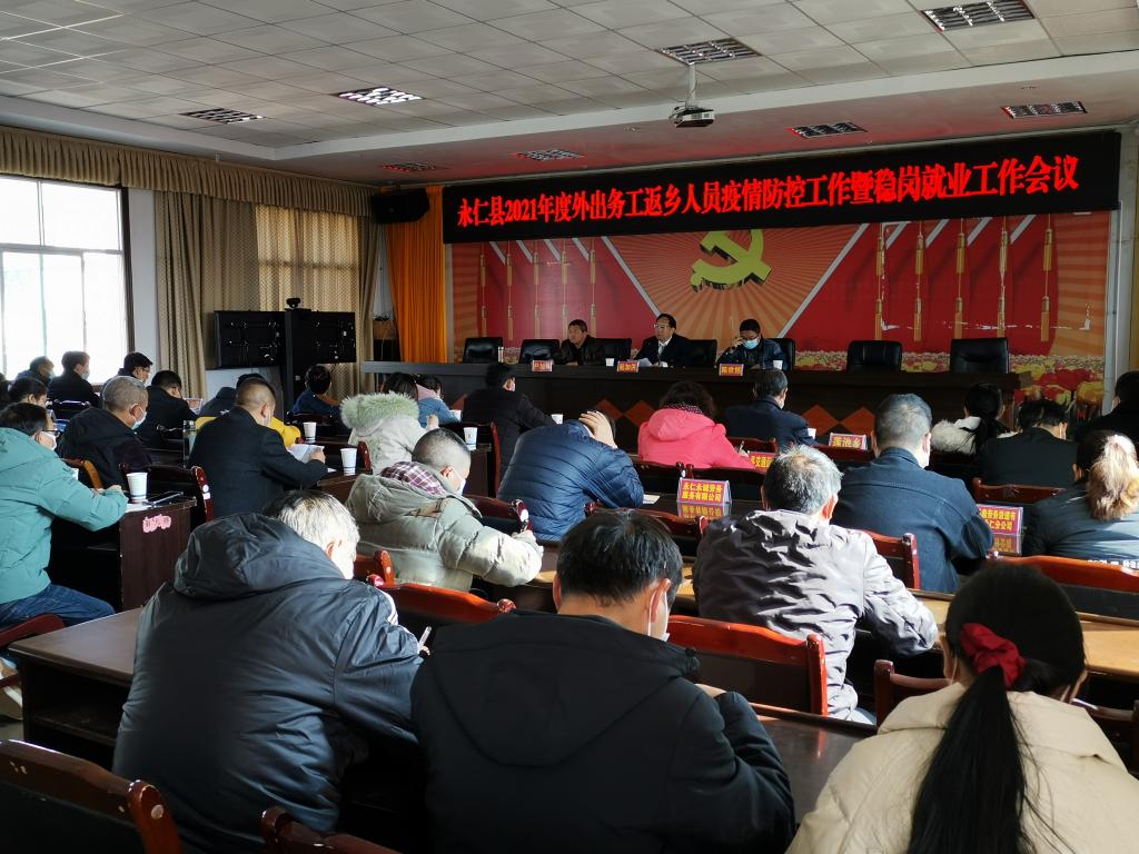 春节即将来临,大量外出务工人员返乡,新冠肺炎疫情防控形势严峻,1月13日下午,永仁县人社局组织召开永仁县2021年度外出务工返乡人员疫情防控工作会议暨稳岗就业工作会议,全县7个乡镇分管领导、9家永仁县技能扶贫和农村劳动力转移就业工作领导小组成员单位领导、县人社局班子成员及具体业务工作人员参加了会议,永仁县人民政府办公室副主任陈世恒到会指导。