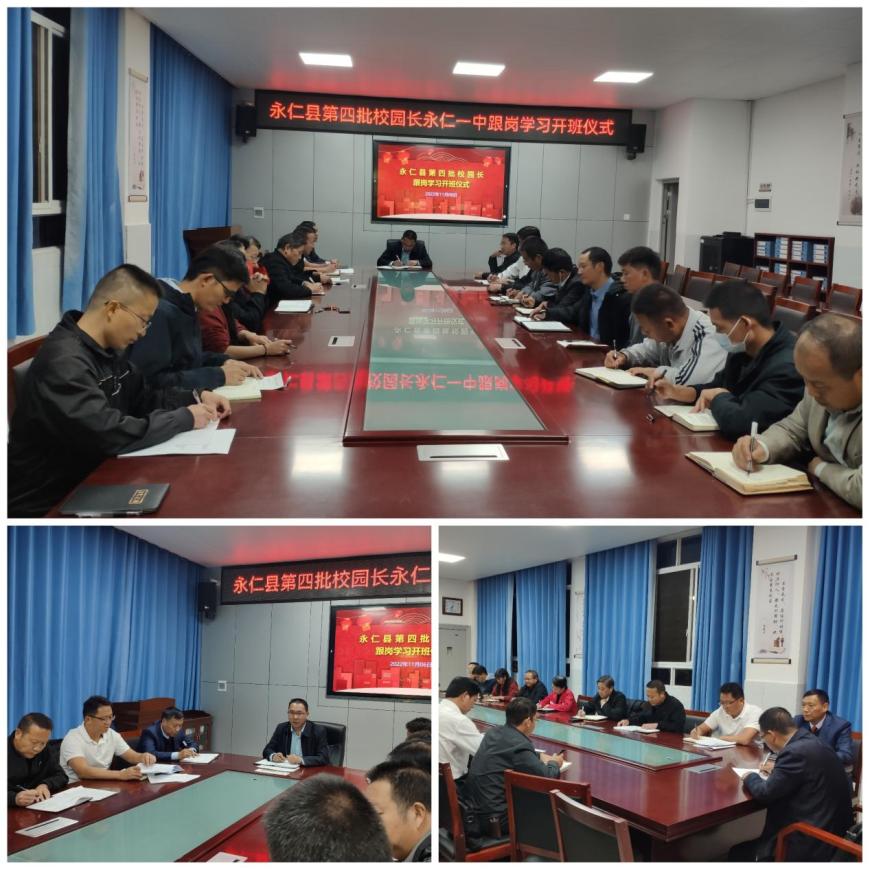 2022年11月6日下午七时,永仁县第四批校园长跟岗学习开班仪式在永仁一中招银楼405室举行。永仁县教体局局长罗雪芹、副局长李斌到会指导,永仁一中主要行政领导及十位跟岗校园长参加会议,会议由永仁一中党总支书记文友主持。