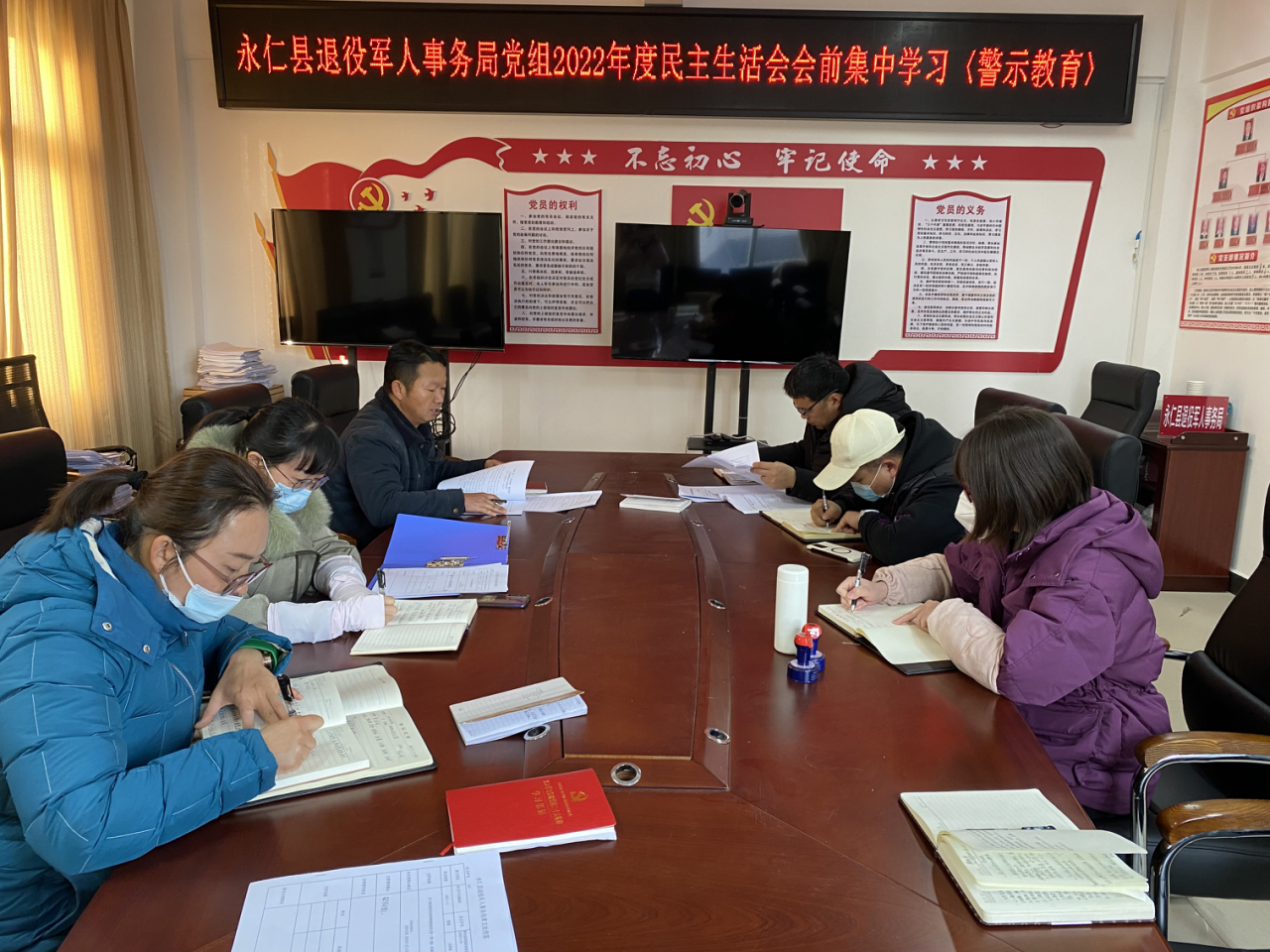 近日,永仁县退役军人事务局党组理论学习中心组召开2023年第一次学习暨民主生活会会前集中学习会议。深入学习贯彻党的二十大精神,全面贯彻习近平新时代中国特色社会主义思想,深刻领悟“两个确立”的决定性意义,增强“四个意识”、坚定“四个自信”、做到“两个维护”,深入开展警示教育,以案为鉴,统一思想、提高认识,为开好民主生活会打牢思想基础。县退役军人事务局党组书记、局长罗永顺主持会议。
