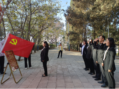 “我志愿加入中国共产党,拥护党的纲领,遵守党的章程,履行党员义务……”在庄严肃穆的烈士陵园纪念碑前全体党员面对鲜红的党旗,高举右拳,重温入党誓词,感悟共产党员的初心使命。