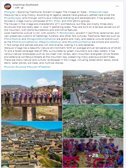 2023年4月,魅力西南Facebook海外账号宣传推广永仁县宜就镇外普拉村,向世界展示了永仁浓厚的彝族文化底蕴及中国传统古村落的魅力,进一步提升了永仁县的国际传播影响力。