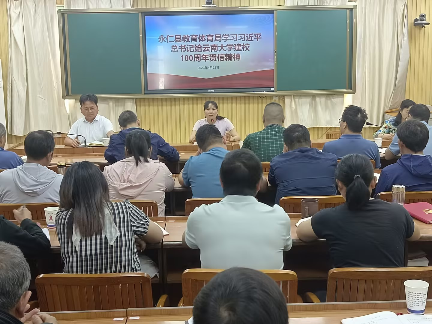 不忘初心,全力以赴!为全面贯彻党的二十大精神和党的教育方针,全面提升办学水平,为党育人、为国育才。永仁县教育体育局组织全体干部职工深入学习贯彻习近平总书记致云南大学建校100周年重要贺信精神。2023年4月23日,永仁县教育体育局组织全体教职工80余人初次学习,5月4日又在教师进修学校三楼会议室再次集中学习贯彻习近平总书记重要贺信精神,学习氛围浓厚,每位干部职工真正做到入脑入心。