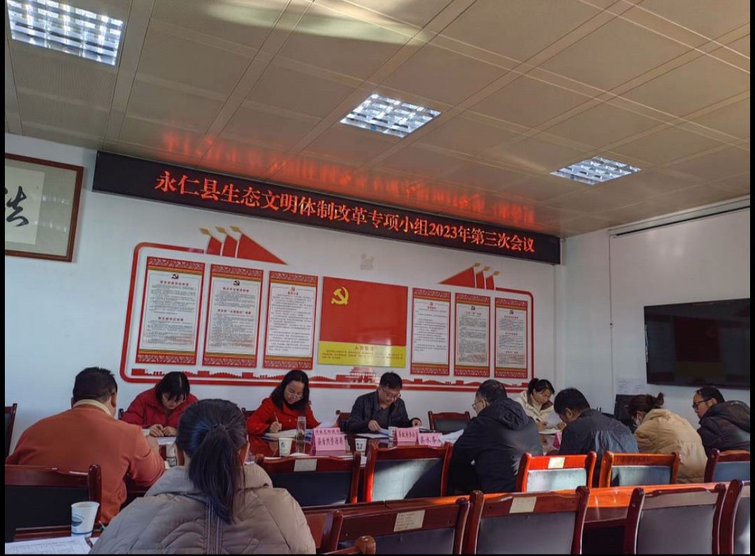 2023年12月12日上午,县委生态文明体制改革专项小组办公室在州生态环境局永仁分局五楼会议室召开永仁县2023年县委生态文明体制改革专项小组第三次会议。县政府办副主任杨晓东主持会议并讲话,县发展改革局、县水务局等共12家成员单位的分管领导参加了会议。
