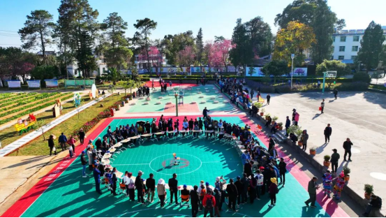 彝族群众就地取材,将篮球场绘制成为一个超大棋盘。