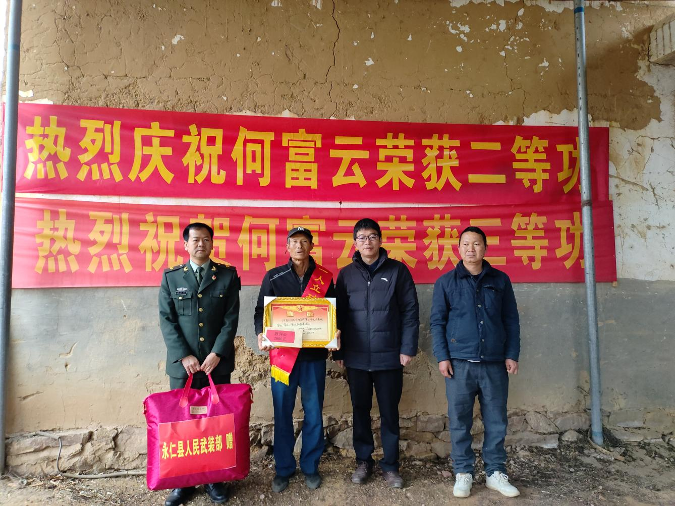 为持续深入开展“学习强军思想,建功强军事业”教育实践活动,大力弘扬拥军优属、拥政爱民的光荣传统,激励军人立足军营建功立业,激发适龄青年投身军队和国防建设的热情,近日,永仁县人民政府副县长尹丽峰、县人民武装部、县退役军人事务局和乡镇分管领导组成慰问组为莲池乡班别新村现役军人何富云家人送去“二等功”牌匾、喜报及慰问金,并向家属表示热烈祝贺,并致以崇高的敬意。