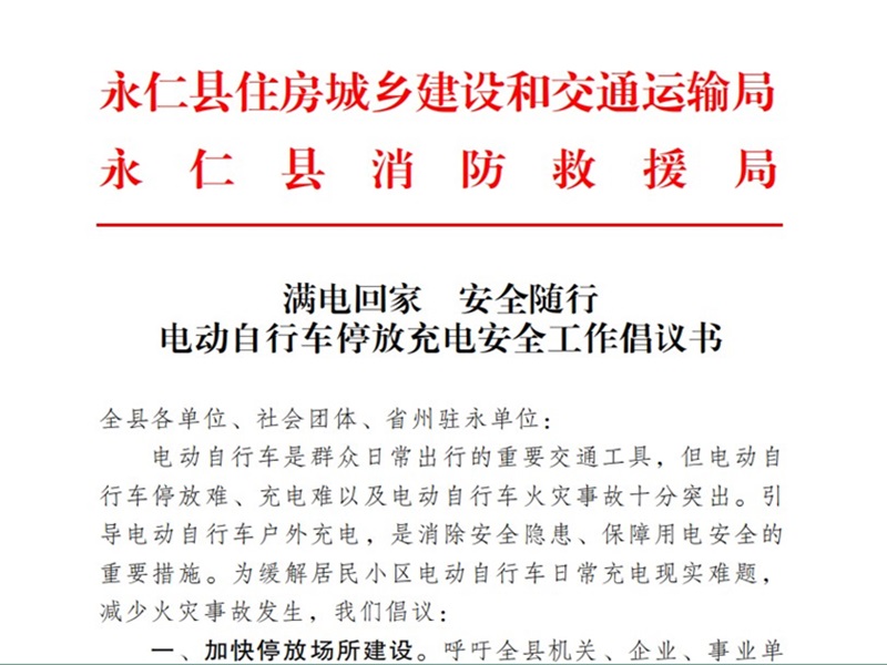 倡议书向全县各单位、社会团体、省州驻永单位发出如下倡议:一是加快停放场所建设。呼吁全县机关、企业、事业单位在本单位管理区域内按照相关安全技术标准,因地制宜,带头建设单位电动自行车集中停放充电场所,并同步安装相应的充电设施和消防设施,切实解决“有得充、愿意充”的现实需求。二是倡导“满电回家”服务。结合实际,合理收取电动自行车充电费用,努力做到充电户内、户外同价,鼓励免费提供充电服务,切实解决“愿意充”的内在需求。自觉做到:在规定区域内对电动自行车进行充电,不在建筑内的公共门厅、疏散通道、电梯间、楼梯间、安全出口、共用走道、楼道,以及消防通道、易燃可燃搭建场所等区域停放充电,做到不“飞线充电、电瓶入户、进入电梯轿厢、人车同屋充电”。三是开展安全宣传教育。全县机关、企业、事业单位应常态化开展职工群众的电动自行车消防安全宣传教育,通过张贴海报、告知书、播放电动自行车警示教育片等多种形式对电动自行车充电、停放、管理开展常态化提示提醒,积极宣传引导本单位职工群众不购买和使用不合格的车辆及配件,不私自改装车辆,及时置换不合格、非标或超标的车辆,引导本单位职工群众带动和监督家人、亲友遵守法规,积极参与和制止各类电动自行车违规停放、充电的行为,确保车辆的安全使用。