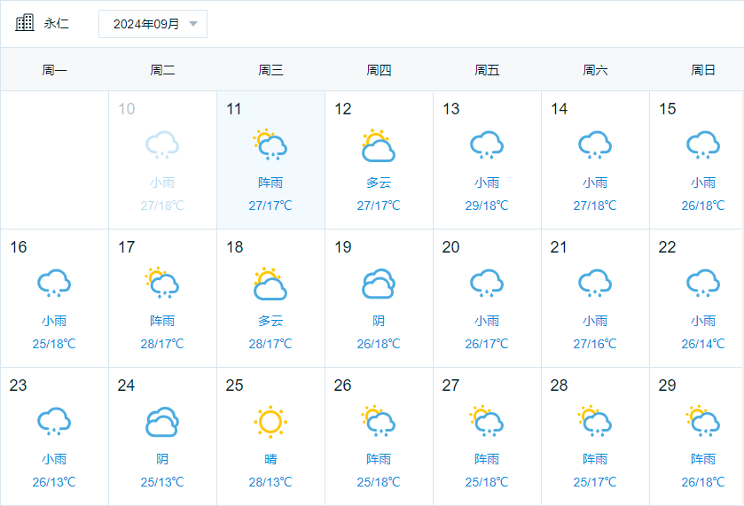 永仁县辖区中秋节期间天气情况