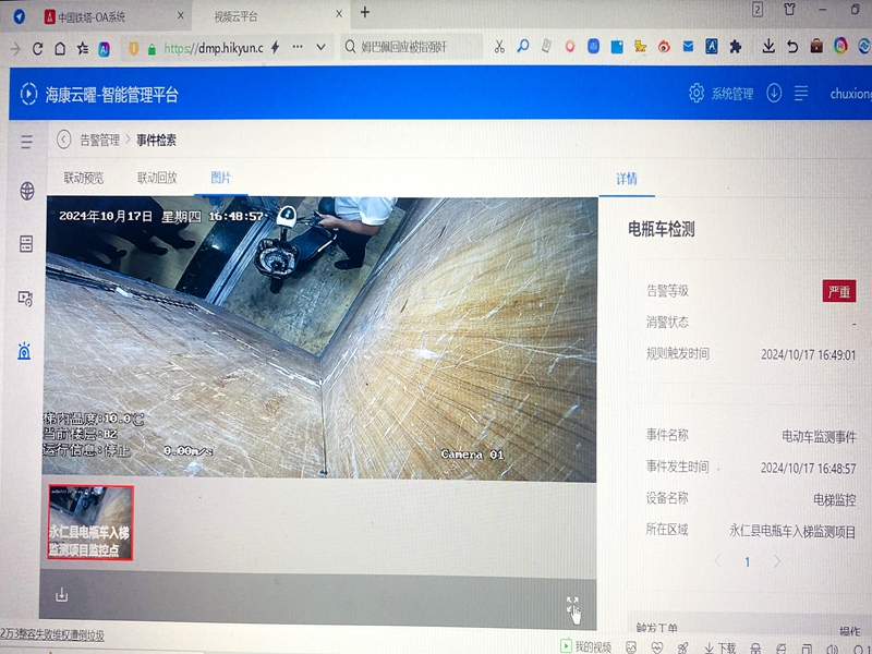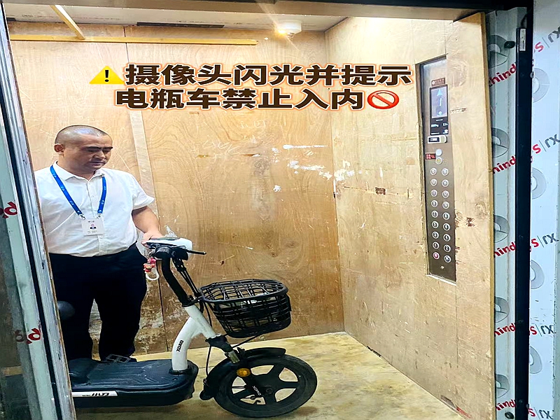 经过实地调研和研究协商,在推动智能充电桩建设的基础上,率先在玫瑰阳光城小区开展高层住宅电梯智能阻车系统的试点安装工作。电梯加装智能阻车系统后,通过后台精准识别到各类电动自行车,并能全方位监控电梯内部情况,排除对婴儿车、自行车、手推车的干扰,运用科技手段从根源上解决电动自行车“上楼入户”问题,确保人民群众生命财产安全。现场测试中,一名物业工作人员推着电动自行车进入电梯,电梯内部顶端摄像头立即出现闪光,随即响起“电瓶车禁止入内,谢谢配合”提示音,并发出“滴……”的警报音,报警装置启动,电梯门“拒绝”关闭,电梯停止运行,直至电动自行车被推出电梯才恢复正常运行。同时,电梯智能阻车系统还可以通过联网监控设备,实时记录下报警画面,帮助物业工作人员精准上门告知。