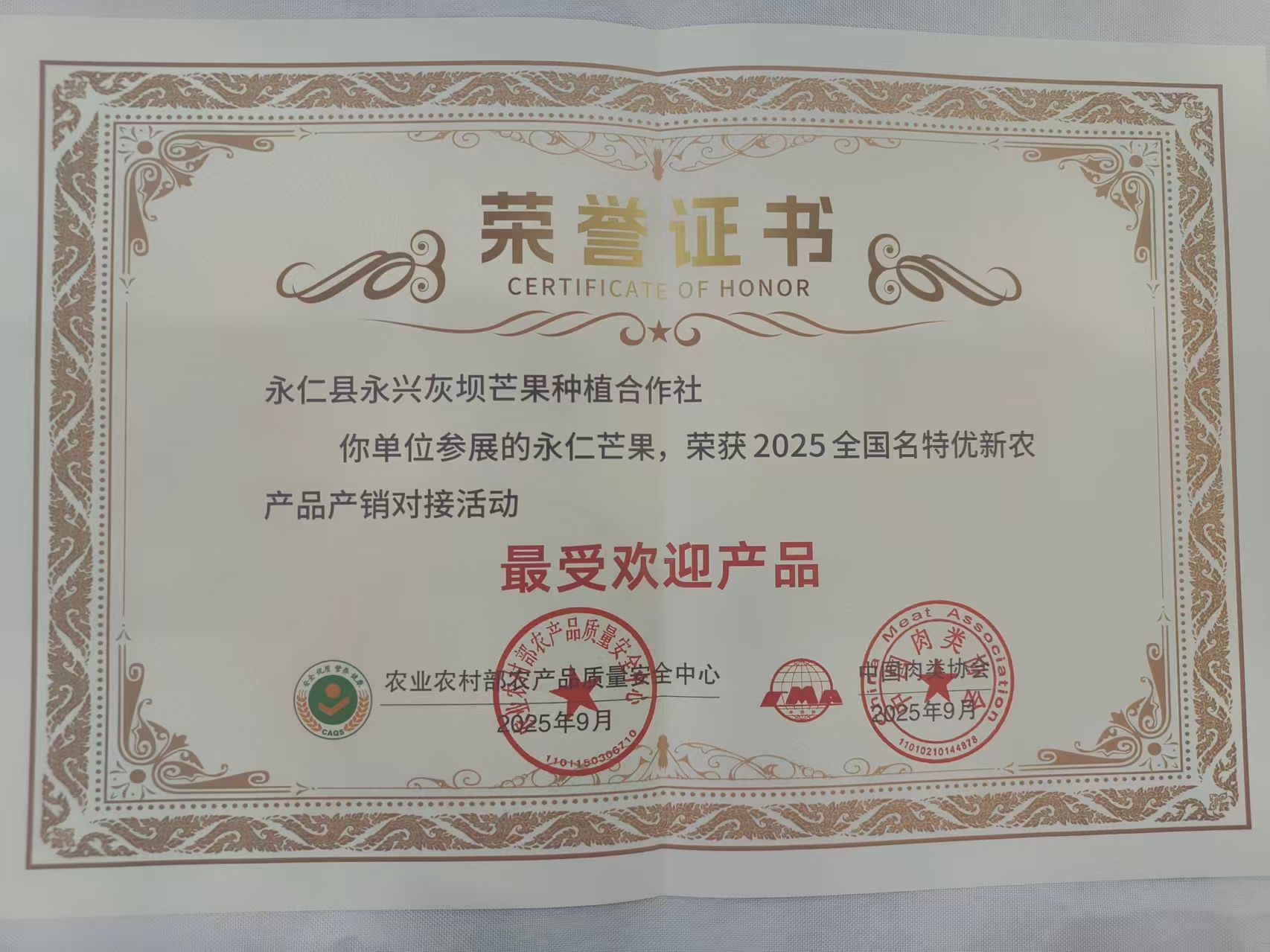 9月17日,永仁县永兴傣族乡灰坝芒果种植合作社选送的“永仁芒果”,再次荣获“全国名特优新农产品产销对接活动最受欢迎产品”称号!这也是该产品继2024年获此荣誉后的第二次登榜,彰显了其持续领先的品牌魅力与市场口碑。