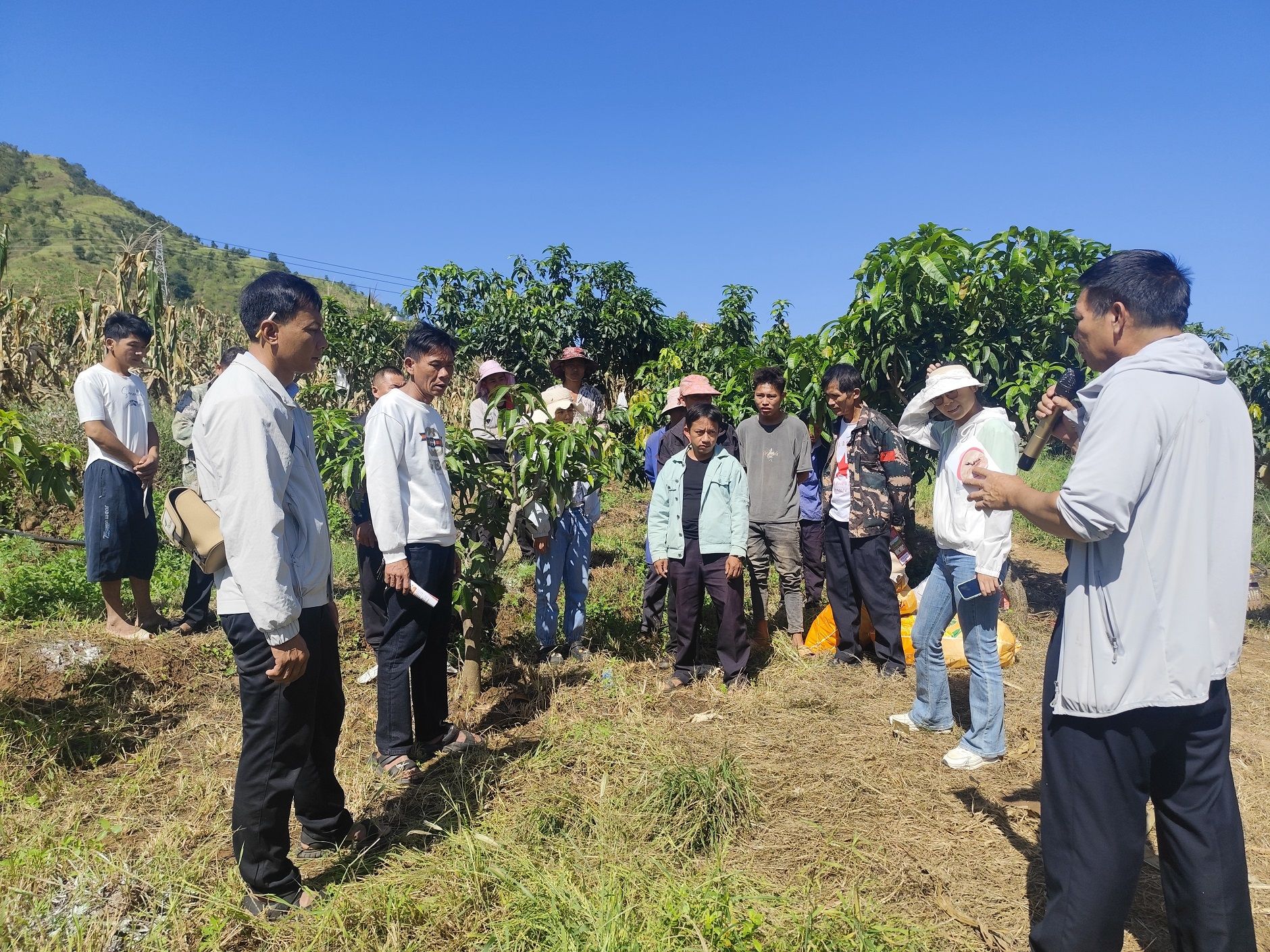 除了红火蚁防控,芒果采后管理更是农户关心的“重头戏”。“芒果摘完不是就没事了,清园、剪枝、施肥这三步是关键,直接关系到明年的产量和品质!”技术人员拿起修枝剪,对着一棵芒果树示范,“病枝、弱枝要从基部剪掉,这样能减少养分消耗;施肥要选腐熟的有机肥、微量元素、水溶肥等,沿着树冠滴水线挖沟埋施,才能让根系更好吸收……”农户们跟着上手尝试,技术人员则穿梭在果园中,手把手纠正动作,从剪枝角度到施肥用量,每一个细节都讲解到位。