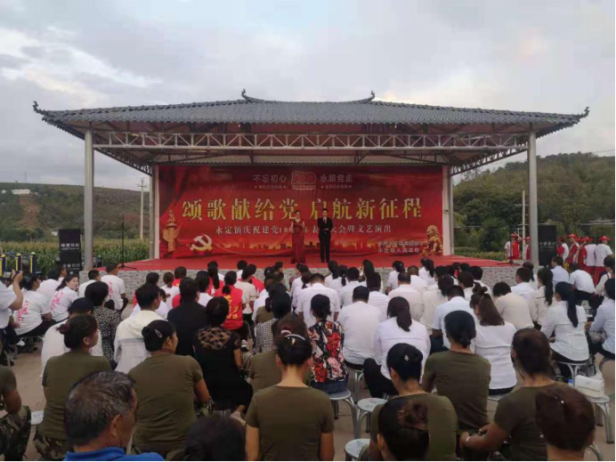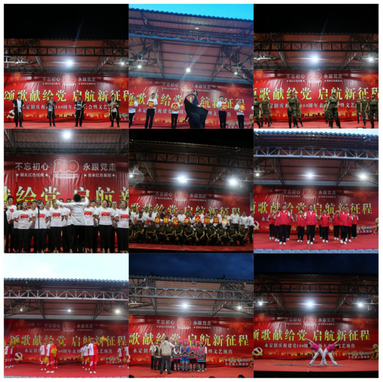 在热烈庆祝中国共产党成立100周年之际,为深入贯彻党的十九大精神,激发广大党员干部的爱国主义热情和投身基层工作的激情,进一步提高党员的责任感、使命感和荣誉感,6月29日晚上,永定镇党委、政府在乍石村委会文化活动广场组织开展“颂歌献给党启航新征程”庆祝建党100周年文艺演出活动,为辖区居民群众送上一场别开生面的视觉盛宴。