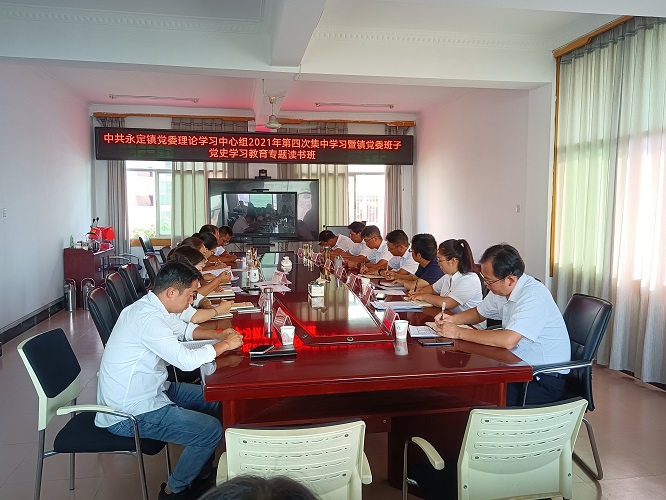 7月24日上午,永定镇党委理论学习中心组2021年第四次集中学习暨党委班子党史学习教育专题读书班在镇人民政府四楼会议室举行。中共永定镇党委书记、镇党史学习教育领导小组组长宛宝山作开班动员暨专题辅导并参加集体研讨。永定镇人民政府镇长、永定镇党史学习教育领导小组第一副组长陶昱主持开班式,县党史学习教育第一巡回指导组组长李培志、副组长闻国会列席旁听;全体镇党政班子成员、镇党政办公室主任、副主任、镇纪委副书记、镇党史学习教育工作领导小组办公室全体人员、镇机关一、二党支部书记、镇青年人才党支部书记、麻栗树村党总支书记、乍石村党总支书记、苴却社区党总支书记参加学习。