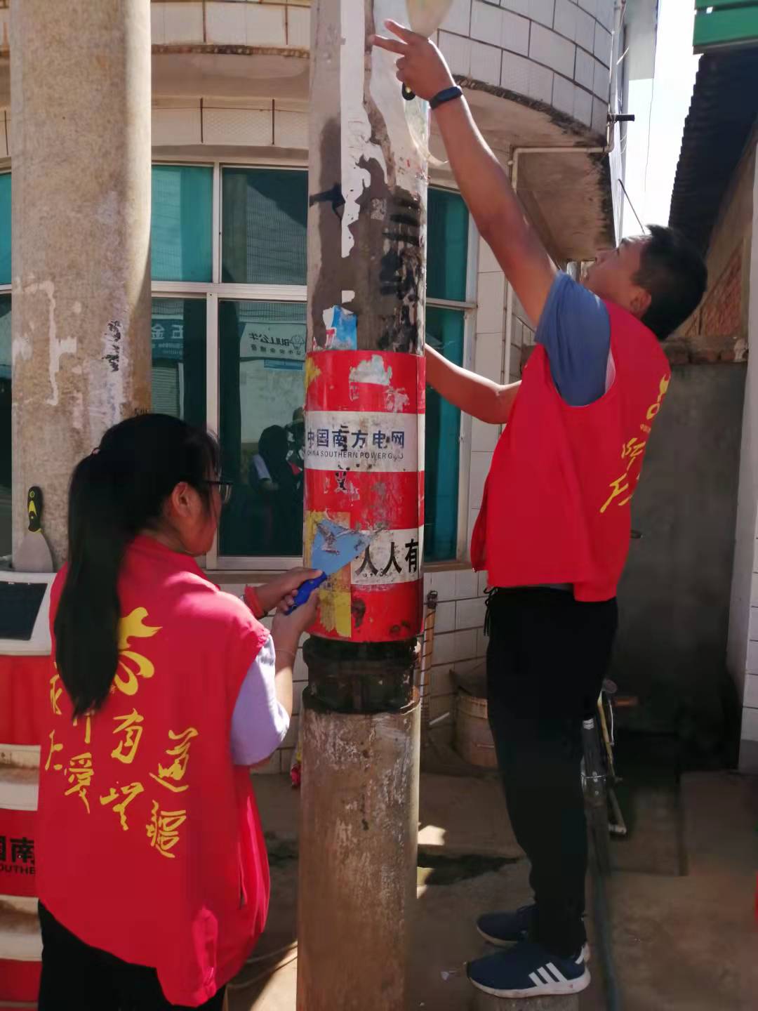 在清理现场,大家纷纷拿起喷壶、小铲子、垃圾袋等工具,仔细铲除电线杆、墙面上的小广告,面对清理难度不同的小广告,大家动足脑子,有的用铲子铲、有得用钢丝球刷……不给小广告留下有“生存”空间,经过一天的努力,小广告清理完毕。