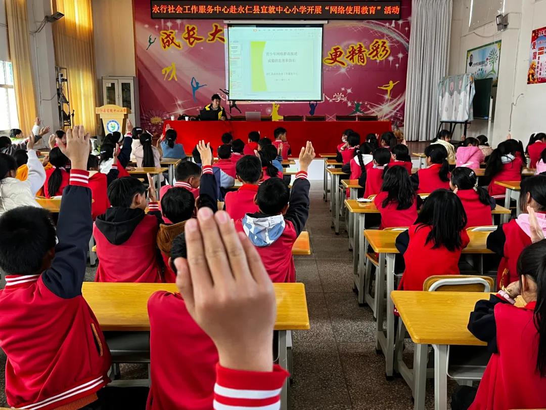12月26日,宜就镇综治中心与永仁县永行社工一同到宜就镇中心完小开展网络使用教育课堂,旨在通过讲座以及互动游戏和知识竞答等方式,利用小学生喜闻乐见的网络游戏这一话题,让参与活动的小学生认识到网络使用和成瘾的现状及定义,原因以及危害,在意识层面树立中小学生正确使用网络的良好意识。