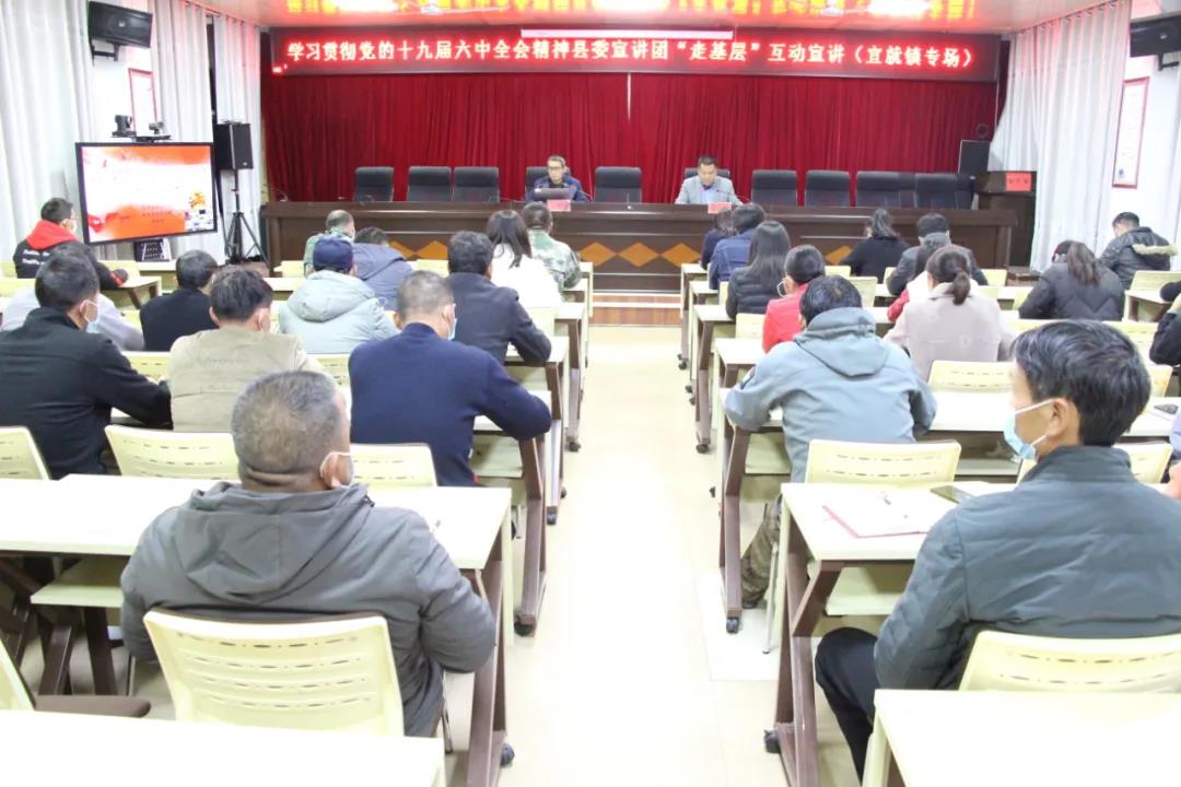12月30日,学习贯彻党的十九届六中全会精神县委宣讲团到宜就镇“走基层”互动宣讲,为最大程度实现资源共享,发挥网络远程教育资源优势,此次宣讲活动通过“云视讯”会议系统同步直播开课,实现宣讲活动在全镇干部职工、农村党员的全覆盖,全镇干部职工及各村党员干部共110余人参加会议,镇党委书记张春培主持会议。