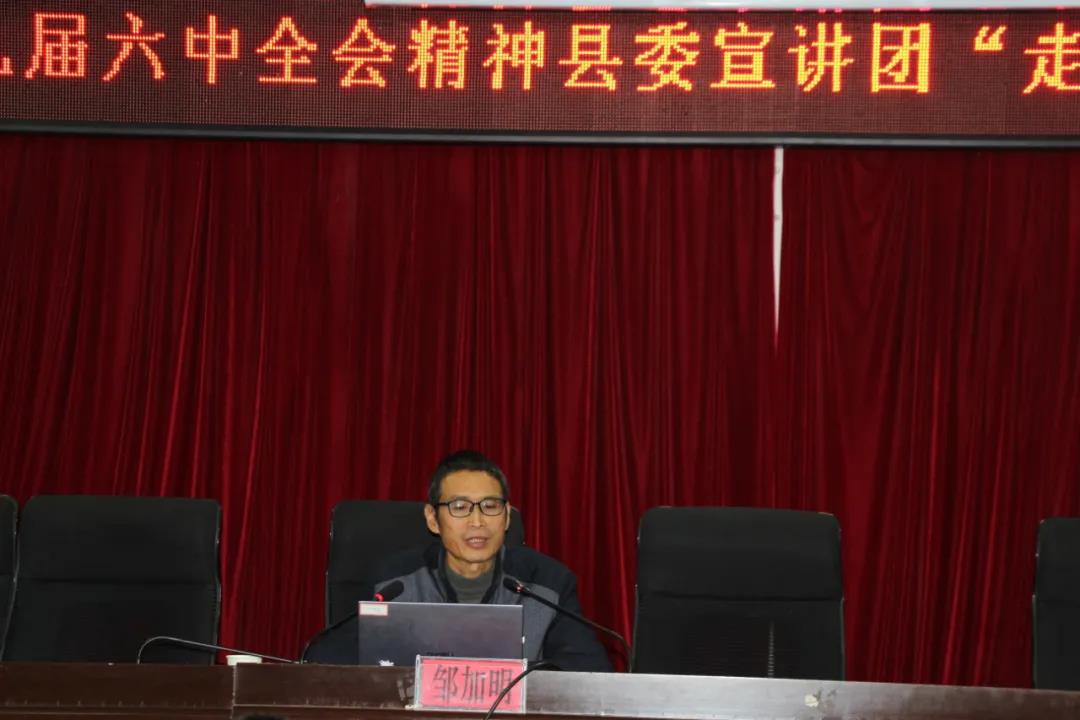 县委宣讲团成员邹加明《从党的百年奋斗中汲取前进的智慧和力量 坚定沿着习近平总书记指引的方向前进》为主题,从“5个深刻认识”、“百年总结”等七个方面,详细阐述了党的十九届六中全会的精神实质和内涵。