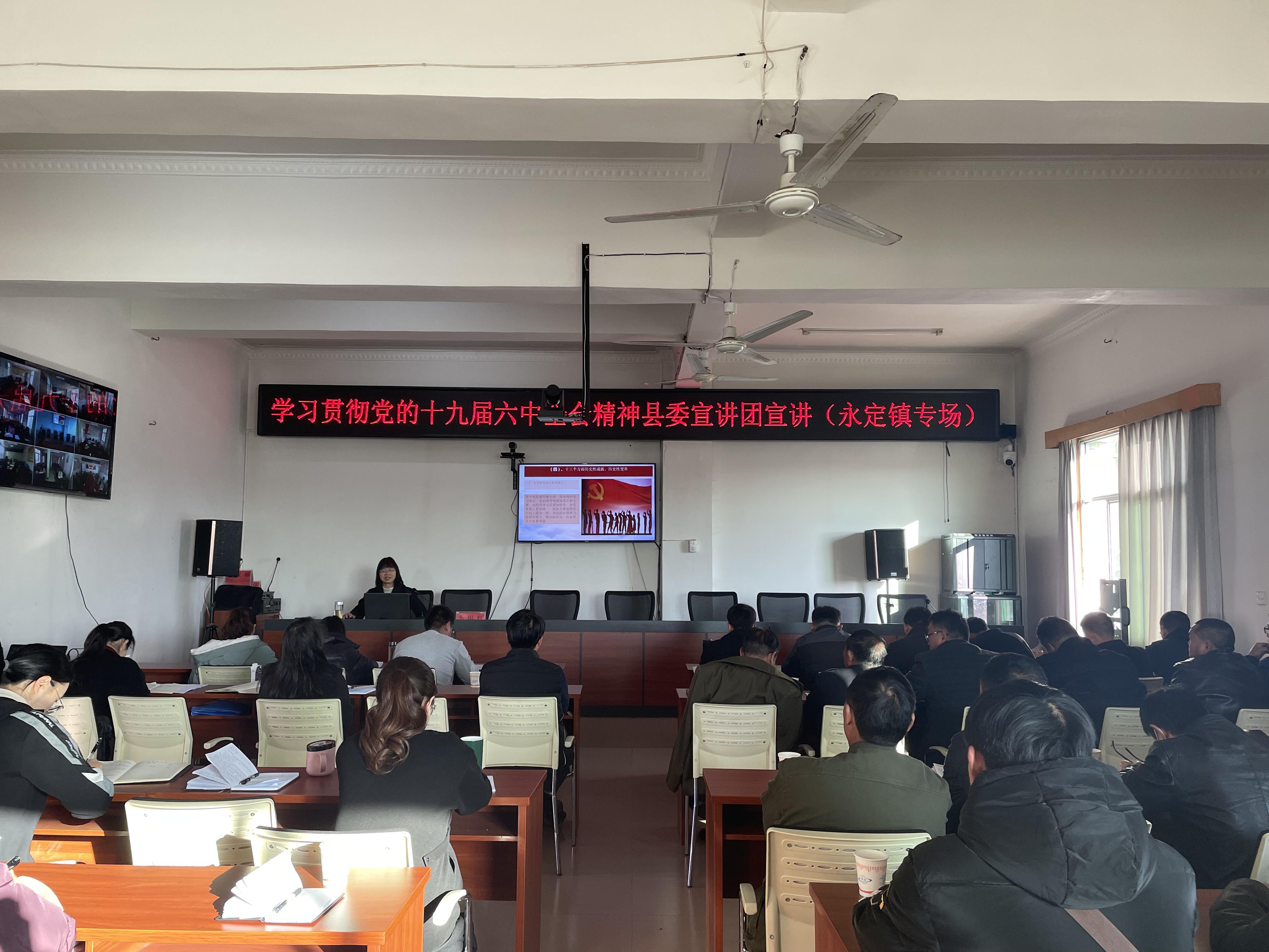 2022年1月4日,学习贯彻党的十九届六中全会精神县委宣讲团集中宣讲活动走进永定镇。县委宣讲团成员、县委党校教师李琪红为全镇党员干部作专题宣讲辅导。全体干部职工在镇主会场参加宣讲,各村委会(社区)五职人员通过云视讯在村委会听取了宣讲辅导。
