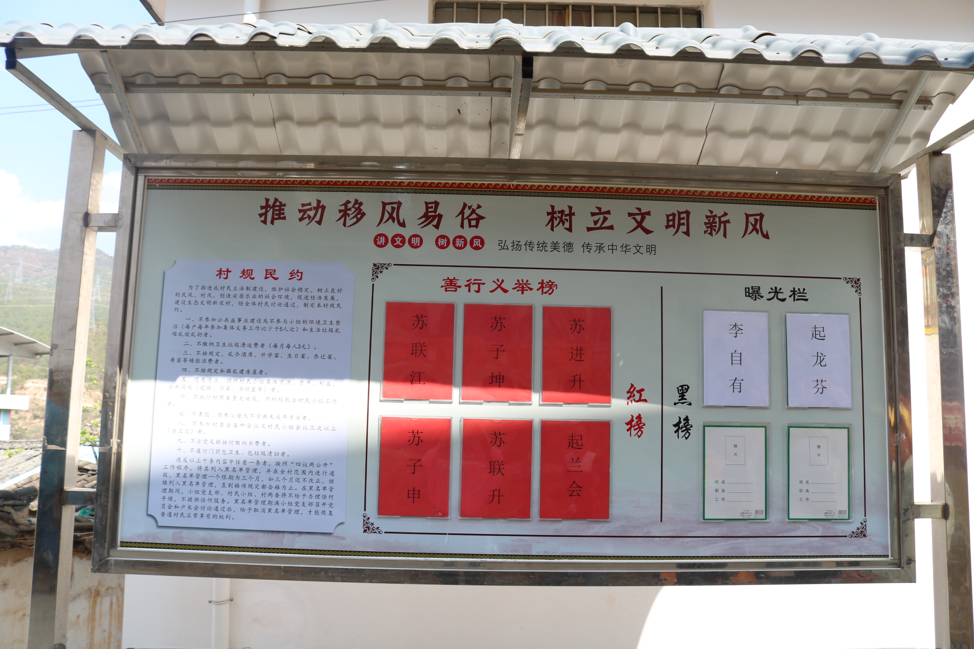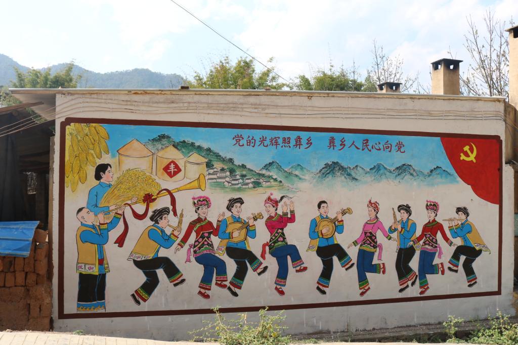三、因地制宜,凸显特色。在“四美”乡村建设过程中,为凸显特色,防止千篇一律。一是尊重地方民俗。直那大村是彝族聚居村,全自然村共有5个村民小组199户656人,99%均为彝族,按照彝族风格,对直那民族亭进行了彝族风貌改造。二是注重挖掘地方的文化。在民房外墙显著位置绘制本地民风民俗及党员带动促民增收的美丽画卷。