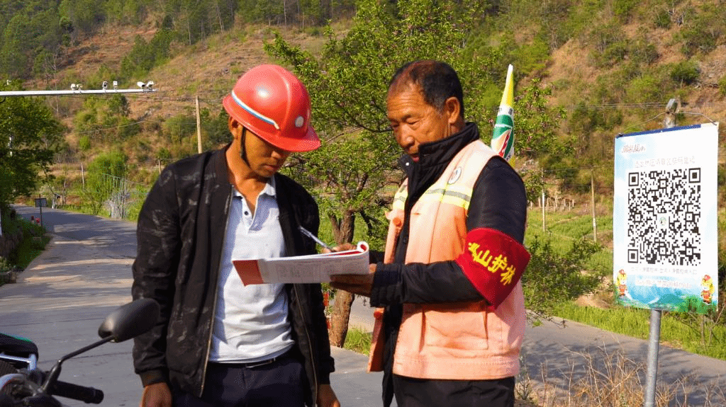 (图为岔河村火源管控点工作人员李林在登记过往车辆和人员信息)