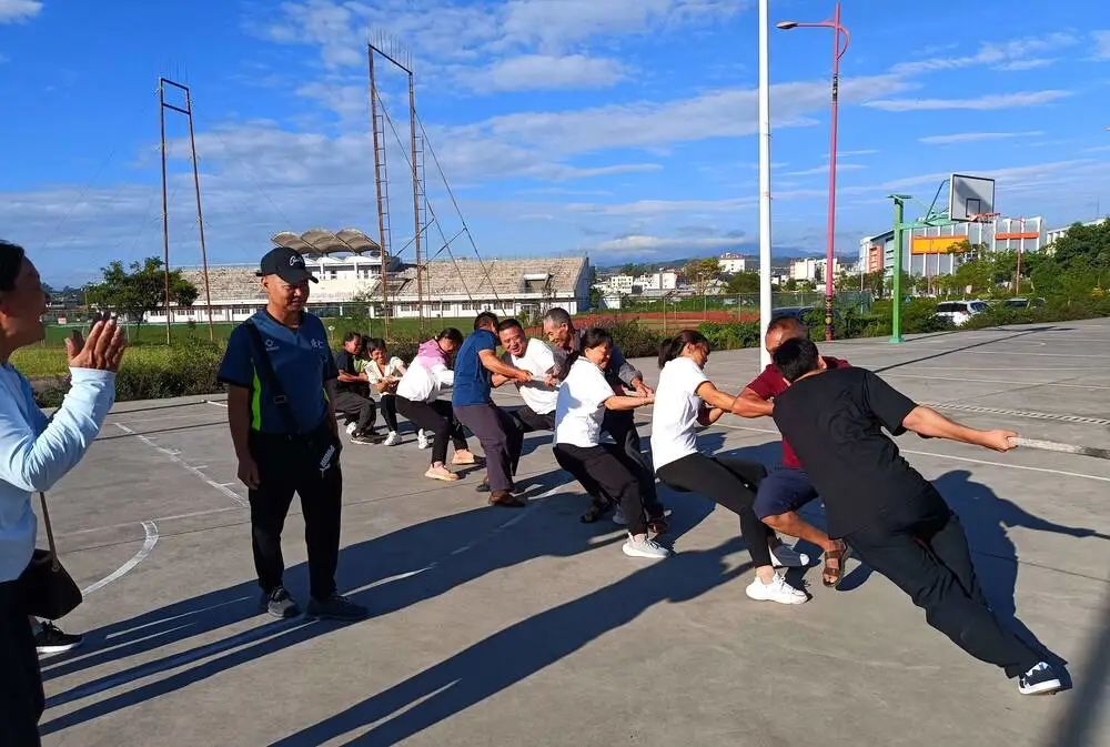 拔河场上,参赛队员们紧握长绳,聚焦麻绳中点,齐心协力、一同发力,展现出良好的精神风貌,现场观众为队员们加油鼓劲,哨子声、加油声、呐喊声此起彼伏,响彻赛场!