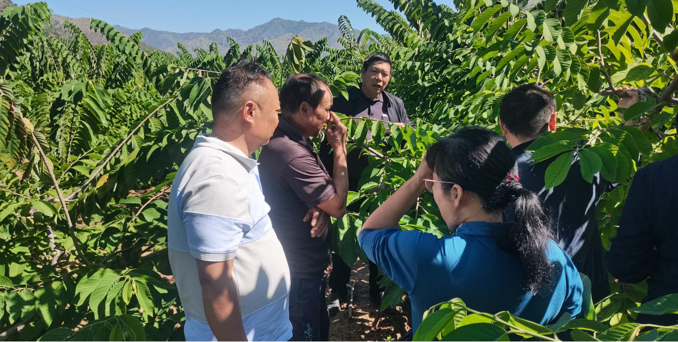 在田兴村实地察看桂圆的种植长势、品种,详细了解地貌、土壤、光照条件等种植条件,就病虫害防治、品种培育、枝条修剪等方面给予细致指导。