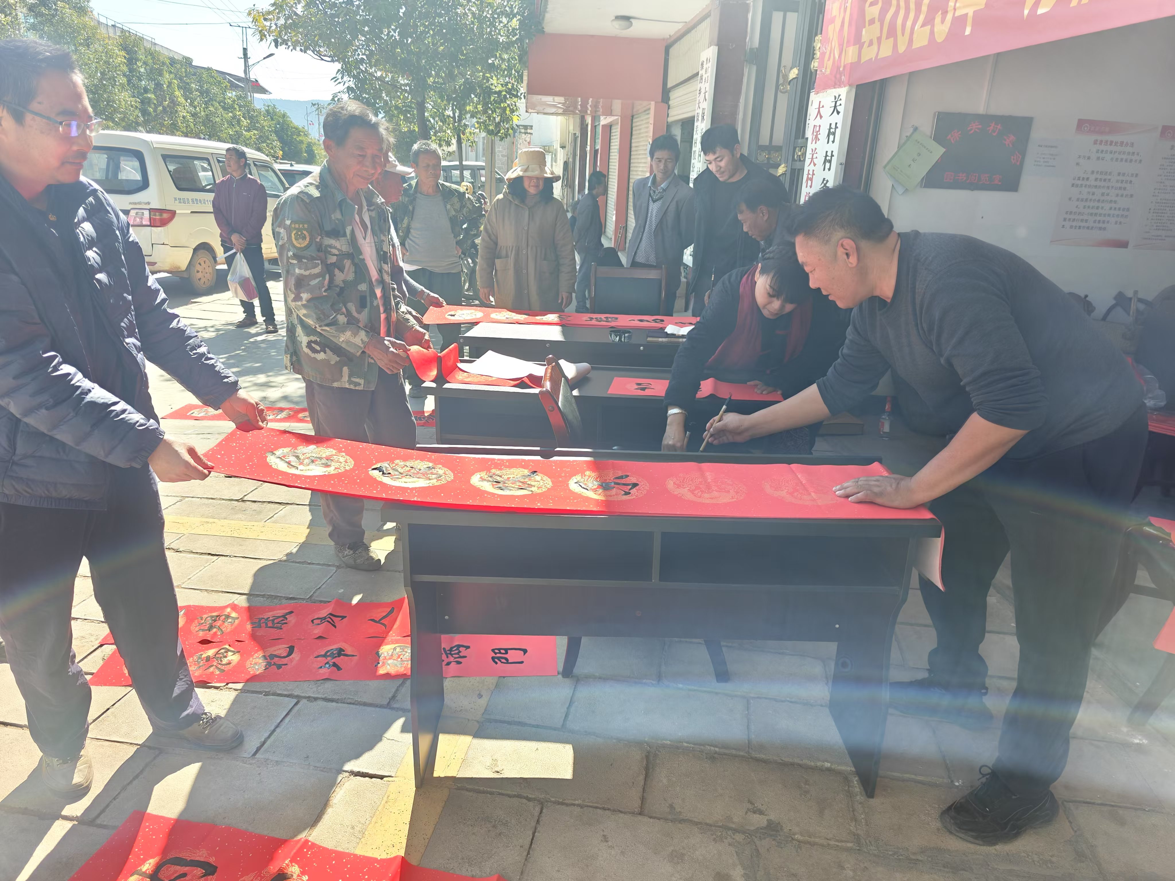 活动现场,活动现场氛围融洽,墨香四溢,书法老师们即席挥毫,笔锋一起一落间,展现的是老师们精湛的书法技艺,传承的是中华优秀传统文化的深厚底蕴。在喜庆的红纸上书写了一副又一副春联佳作。往来的村民们看见这一幅幅技艺精湛的书法,连连称赞,纷纷领取了自己心仪的春联。一幅幅饱含寓意的"万事如意"、"五福临门"、"天地人四海同春松竹梅三阳开泰"等等样式的春联被大家一扫而空。此外,书法老师们还书写了众多的"福"字赠与村民。