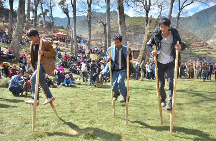 踩高跷又名双拐,是彝族聚居区一种群众喜闻乐见的民族体育活动。是用直径2公分左右罗汉松树干,在下半部留上一个树枝,用来踏脚。