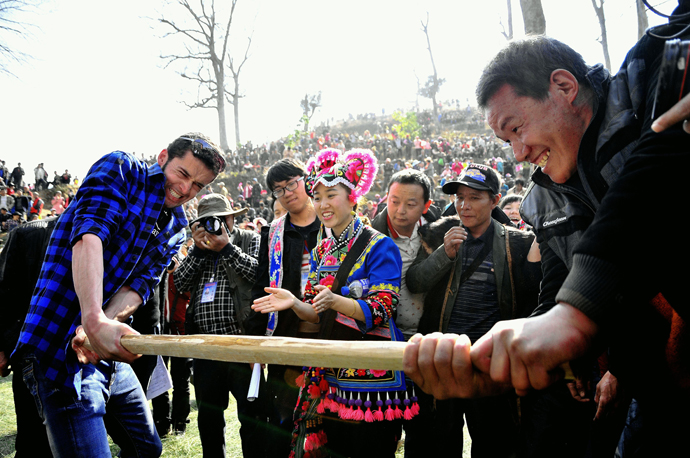到节庆日的时候,彝族小伙子们把山上又粗又长又结实的树藤砍回家,把树藤当作比赛器材搬上了竞技场。