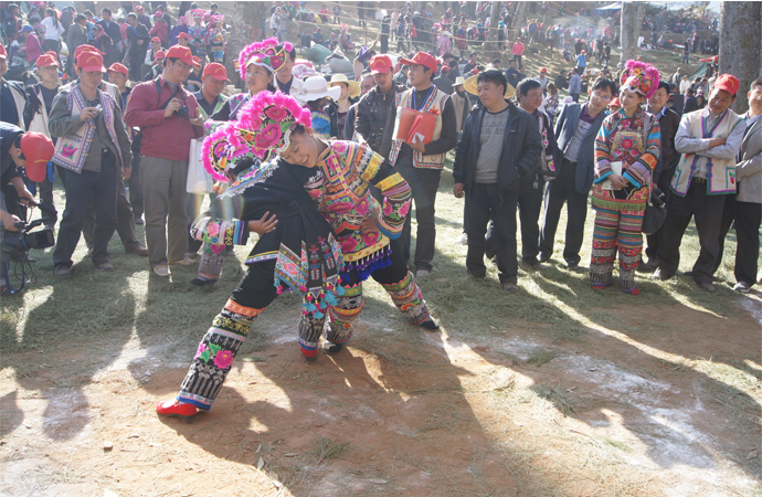 但在我们彝家山寨还有一项人们自创的项目“顶肩”,男女老少皆可参加。在一个直径3米的圆圈中,体重相近的两个参赛选手站在圆中,当比赛信号响,参赛选手弓步站立,一名选手的左肩顶住另一名选手的右肩,相互顶力,想办法把对手在规定的时间内顶出圆圈为胜。