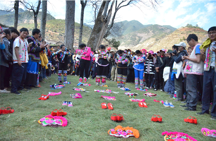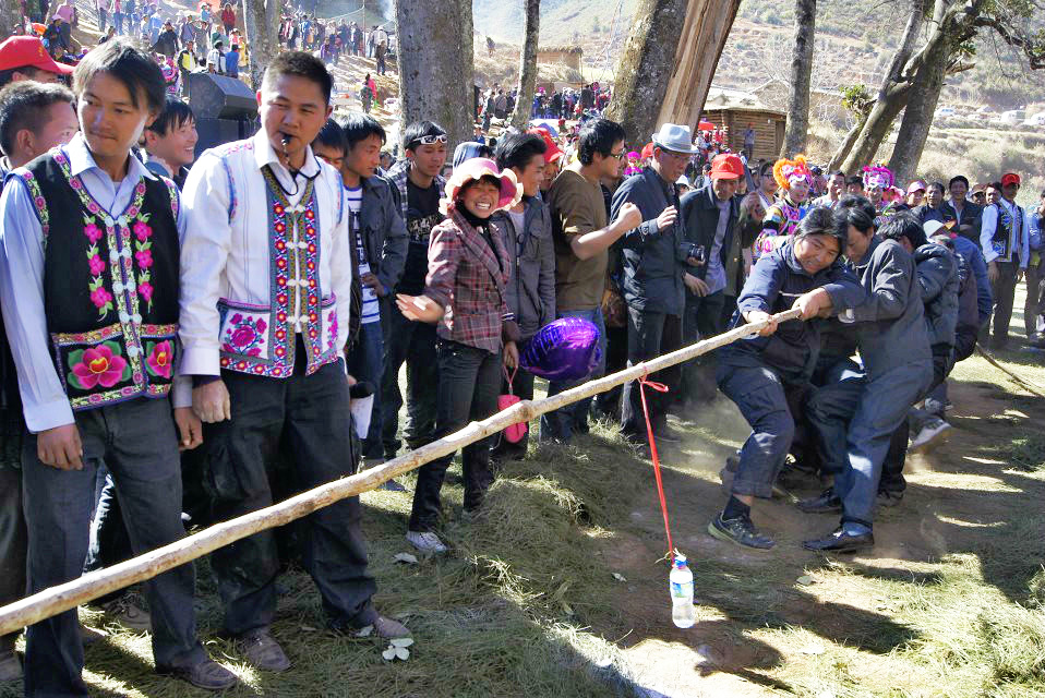彝族青年们个个穿上羊皮褂,全身心的投入到拔河比赛中,小姑娘们穿着鲜艳的彝族服装,在旁边观战。姑娘们羞答答地瞅着小伙子们,看谁卖力,这将是姑娘们选择意中人的好机会。