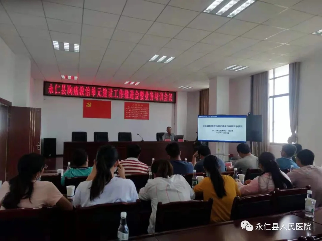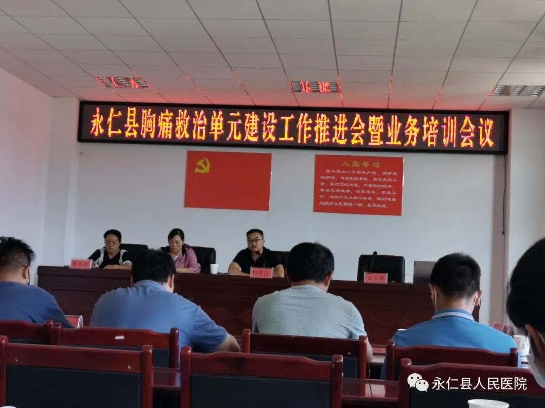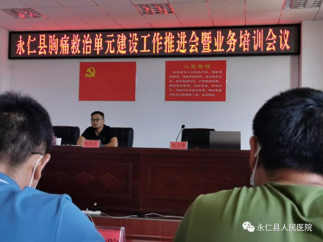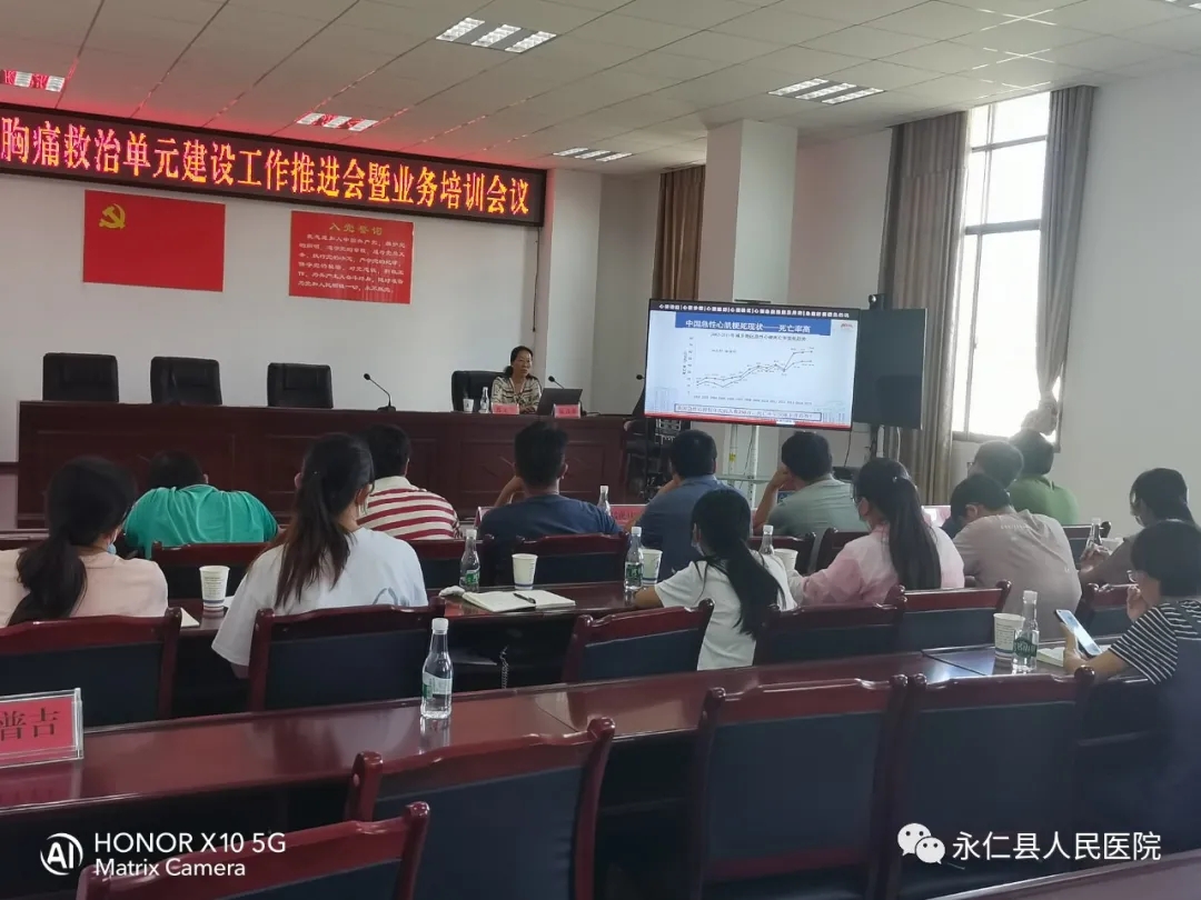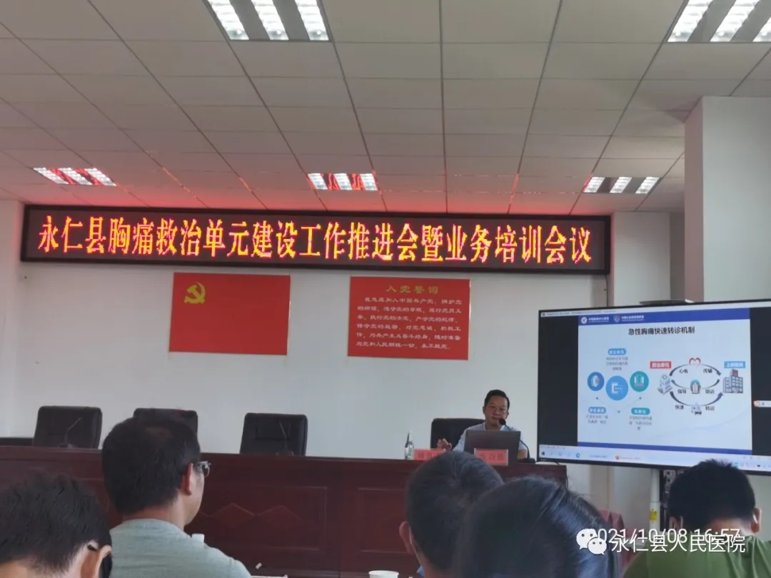为加快建全永仁县胸痛患者区域协同救治体系,稳步推进永仁县基层胸痛救治单元建设工作,打通胸痛救治单元起跑第一公里,在永仁县卫生健康局的高度重视和领导下,2021年10月8日下午,在县卫生健康局五楼会议室召开了永仁县胸痛救治单元推进会暨培训会。县卫生健康局副局长詹普吉,县卫生健康局医政药政科科长孙海燕,县人民医院副院长、胸痛中心副主任陈春琼,县人民医院胸痛中心医疗总监周颖森,7家乡镇卫生院院长及胸痛救治单元核心成员等20余人参会。