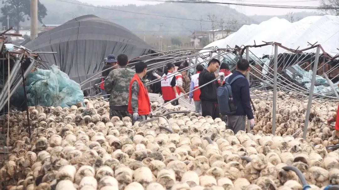 在猛虎乡阿里地村委会,记者看到大片大棚被压倒了,塑料薄膜千疮百孔,阳光的照射下形成一道道斑驳的光影。面对灾情,党员干部群众积极投入到救灾行动中。
