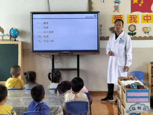 小五班,王俊婷爸爸为我们带来一节《儿童常见出诊性疾病的特点》活动课。主要讲了常见的几种疾病:麻疹、风疹、幼儿急疹、水痘、手足口病等一些疾病。在讲解过程中采用直观的图片让幼儿了解相关的知识。在课堂中还讲到怎样预防这些疾病,用15字防病口诀:洗净手、喝开水、吃熟食、勤通风、晒衣被。通过通俗易懂的口诀方式让幼儿知道怎么预防常见疾病。让幼儿对常见疾病有了进一步的了解和懂得预防疾病相关知识。