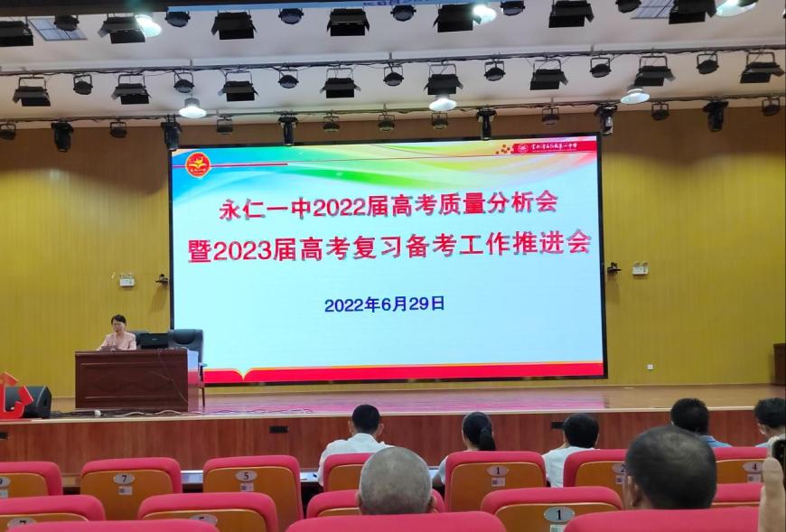 正所谓“善弈者谋势,善谋者致远”。为了对2022年的高考成绩进行理性分析,总结经验、查找问题,进一步强化质量意识,提高教学效益,促进我校教育教学质量的稳步提升,为打赢2023、2024届高考的翻身仗提前做更充分的准备与更科学的规划。 2022年6月29日19点,在永仁一中思源会堂隆重举行永仁一中2022届高考质量分析会暨2023届高考复习备考工作推进会。会议由永仁一中张淑媚副校长主持,参加会议的有县教体局副局长刘修苑、教科室负责人苏文;县教育工委委员、永仁一中校长朱卫星及2022届、2023届全体科任教师及2024届备课组长。