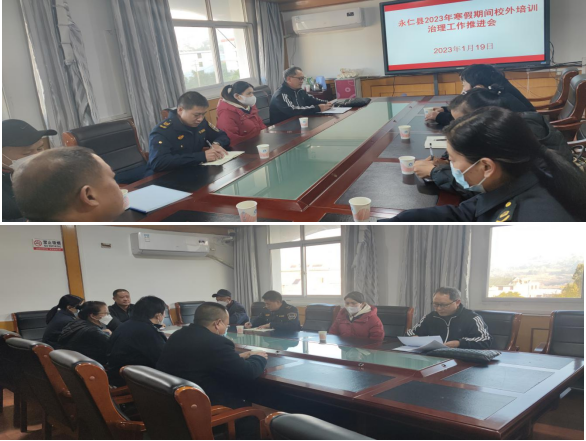 二、工作部署。2023年1月19日,中共永仁县委教育工作领导小组秘书组组织县教育体育局、文化和旅游局、公安局、民政局、人力资源和社会保障局、住房和城乡建设局、消防救援大队、市场监督管理局、行政审批局派出的执法人员,在县教育体育局召开了“永仁县2023年寒假期间校外培训治理工作推进会”,明确了任务举措,制定了时间表、路线图,确保寒假期间校外培训治理各项工作有序、有力、有效开展,要紧盯培训主体、人员、时间、地点、内容、方式、收费等关键要素,压实责任,全面深入开展排查治理工作。会上还向参会人员下发了秘书组制定的《永仁县2023年寒假期间校外培训治理工作方案》,要求各部门认真落实方案,履行好职能职责,使我县寒假期间校外培训治理工作取得成效。