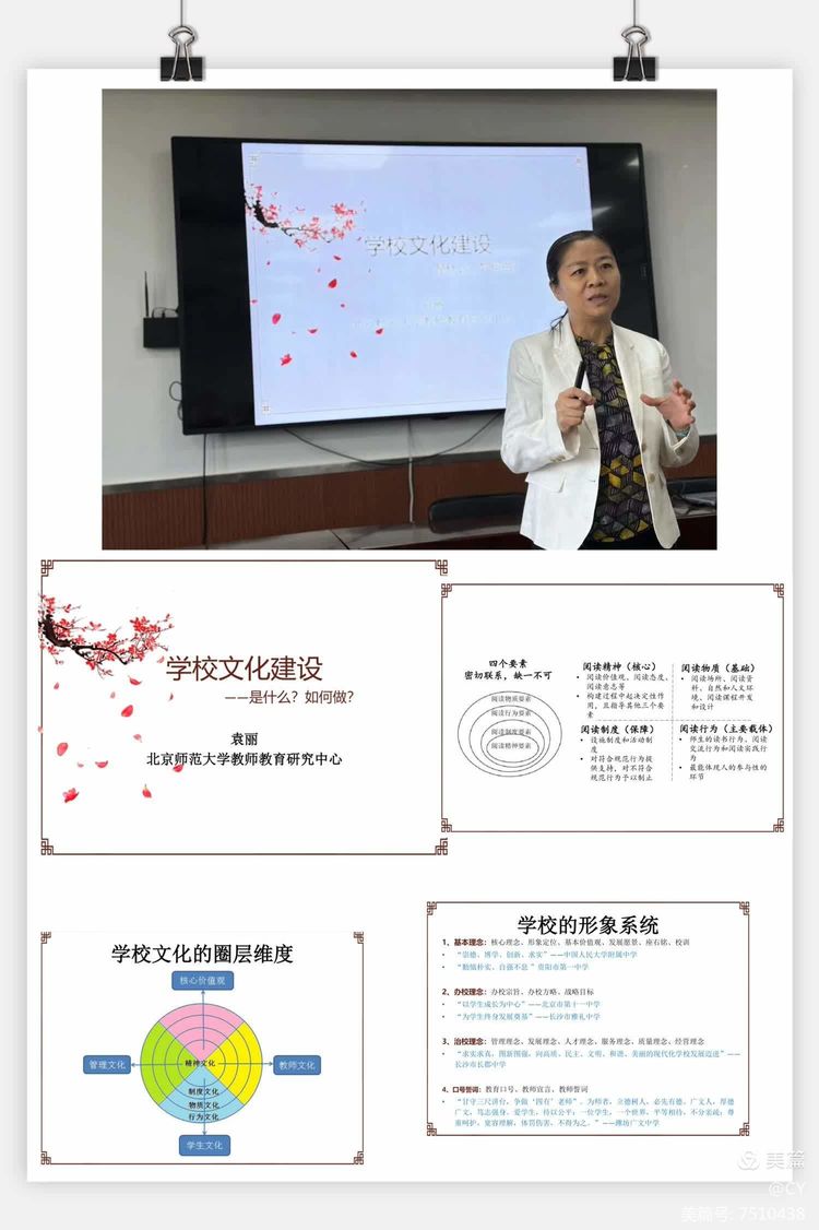 10月12日上午,聆听了北京师范大学教师教育研究中心袁丽老师的《学校文化建设》专题讲座从学校文化建设整体方向与概念对学校文化建设进行了深入浅出的解读,使我们明白学校文化建设是一个系统工程,它需要全体师生的共同参与和不懈努力。通过不断优化校园文化环境,丰富校园文化活动,完善校园文化制度,可以有效地提升学校的整体教育质量,培养出更多具有良好品德和创新能力的人才。