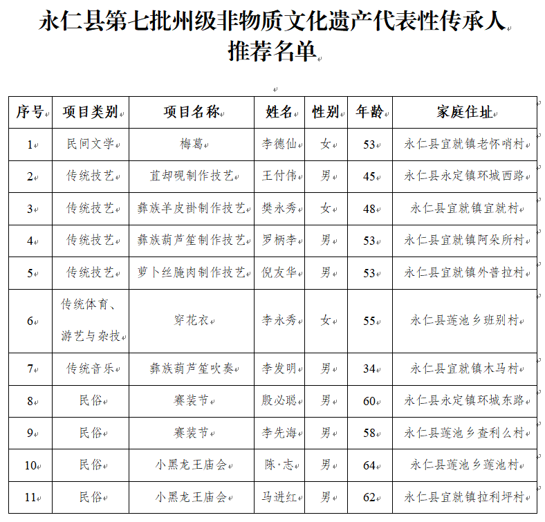 根据《中华人民共和国非物质文化遗产法》的相关规定,按照楚雄州文化和旅游局《关于组织开展楚雄州第七批州级非物质文化遗产代表性项目和代表性传承人推荐申报工作方案》文件要求,永仁县文化旅游和体育局坚持公开、公平、公正原则,于8月4日召开第七批非物质文化遗产代表性传承人推荐申报工作会议,坚持公开、公平、公正原则,经过传承人申报、乡镇推荐、非遗评审委员会专家组认真评审、社会调查、征求乡镇和县级部门意见等形式,提出了第七批州级非物质文化遗产代表性传承人推荐名单。现将推荐名单向社会公示,公示期10天,自即日起至2025年8月14日止。若有异议请在公示期内来函、来电等方式向县文化旅游和体育局提出。通讯地址:永仁县永定镇建设路9号,联系人:林芳宇,联系电话:0878-6716069。