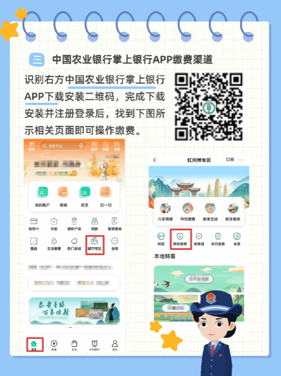 2.银行网点代征:缴费人携带户口本或身份证、银行卡到农信社或农业银行网点,由银行工作人员柜面办理缴费,或在自助终端机上自行操作缴费。
