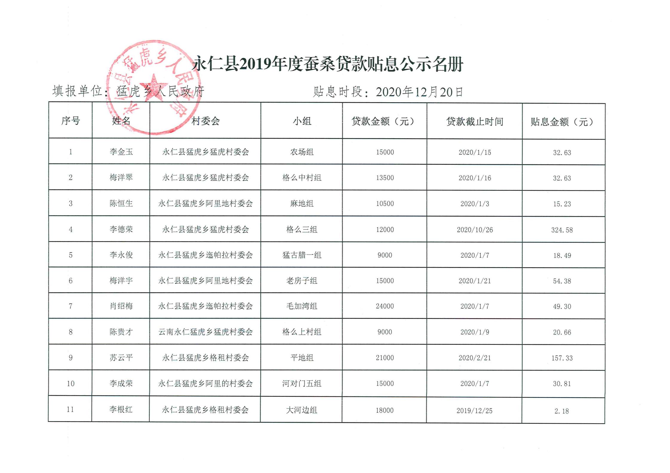 附:永仁县猛虎乡2019年蚕桑贷款贴息公示名册