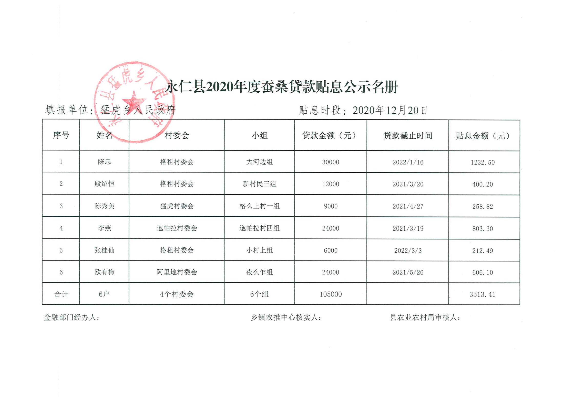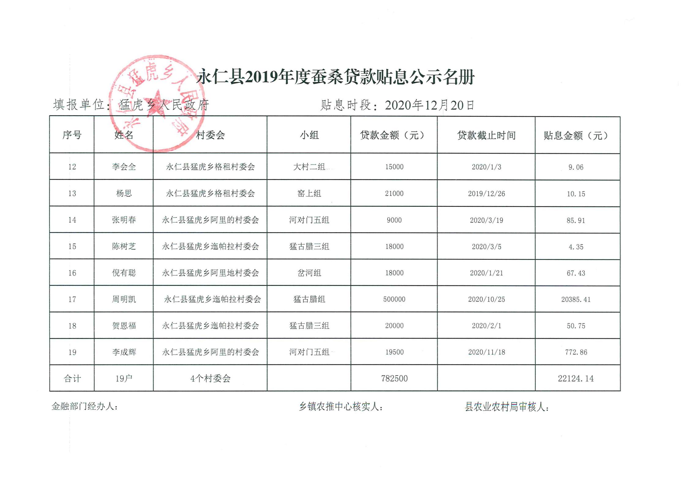 猛虎乡2019-2020年蚕桑贷款贴息公示