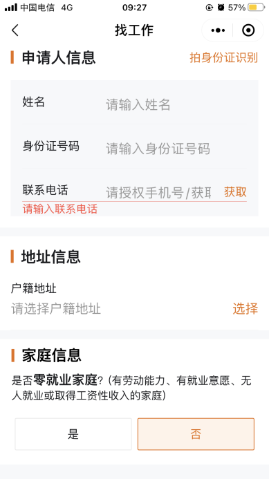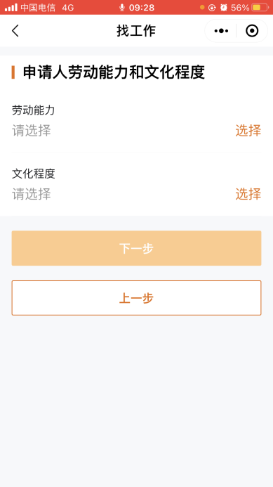 填写个人基本信息、劳动能力、文化程度、就业意向进行申请。