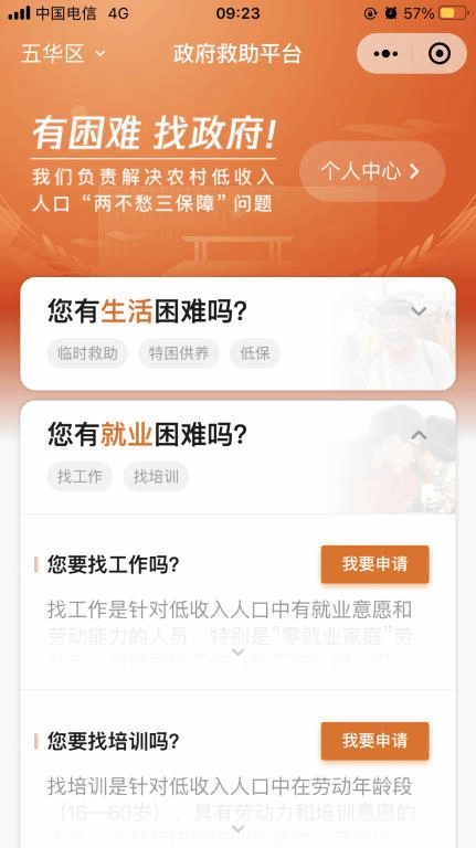 页面显示“云南省政府救助平台”------您有就业困难吗?-------找工作、找培训,选我要申请!