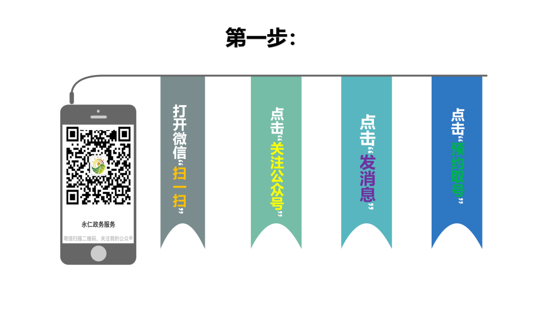 第一步:关注“永仁政务服务”公众号后,点击“预约取号”——“预约取号”;