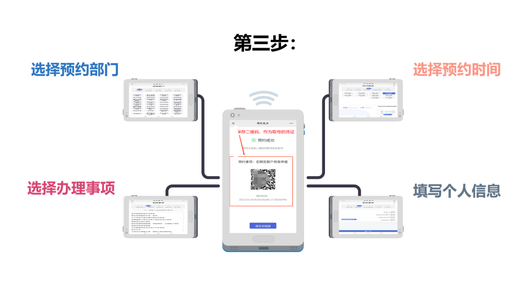 第三步:选择所办理业务的“部门”——“办理事项”,选择“预约时间”,填写个人信息,并确认预约(注:确保手机号码填写正确)。