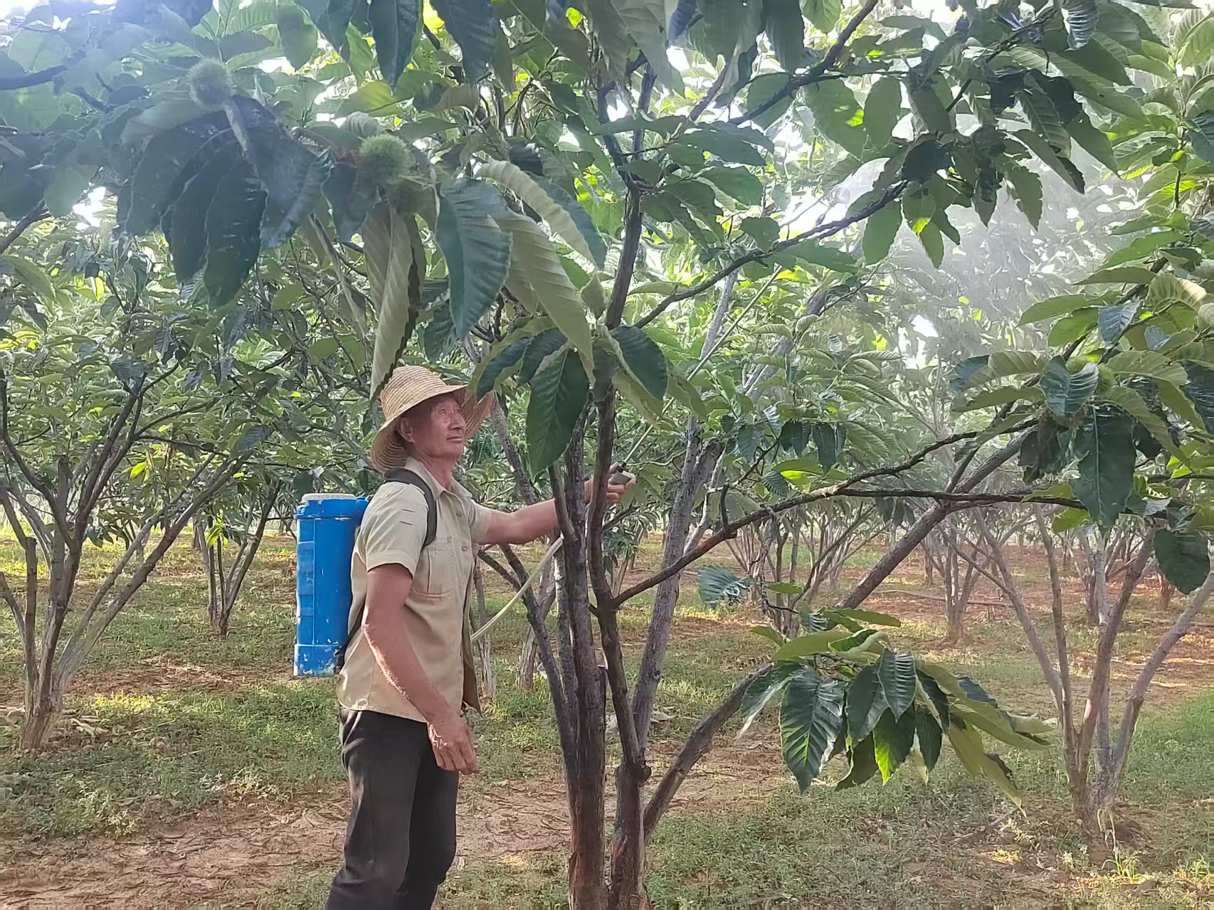 在田间实操部分,技术人员针对班别村高发的栗实象甲虫、蚧壳虫等病虫害,现场演示了科学施药方法,同时推广物理防治技术,如在树干基部缠绕粘虫胶带、设置诱杀装置等。此外,技术人员还就保果增产关键技术进行了讲解,通过调整水肥配比、合理疏果等措施,帮助农户提升板栗的产量与品质。