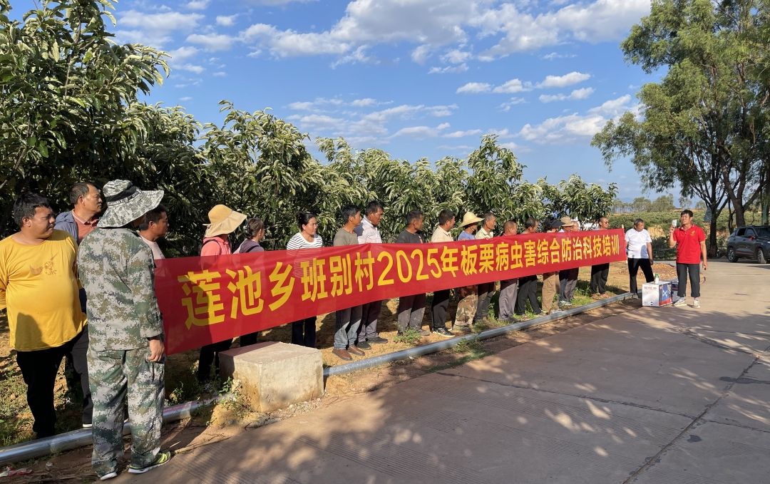 产业要发展,关键在人才。莲池乡始终坚持“走出去学经验、请进来传技术”的策略,为板栗产业持续注入“智力活水”。一方面,组织外出取经拓宽视野,累计选派林果专班、合作社社员及种植大户3批30余人次,前往易门县浦贝乡学习先进种植管理模式;另一方面,邀请迁西、易门等地技术专家及本土“土专家”开展培训6期,发放技术手册490余份,从栗园深耕、树干涂白到剪枝施肥,手把手传授科学种植技术,引入“无人机飞防”等科技防治手段,切实强化农户实操技能;同时,注重本土队伍力量建设,组建15人的专业产业服务队,培育4名本土产业工人,实现“田间有指导、难题有人解”,确保技术服务精准直达一线,支撑产业健康发展。